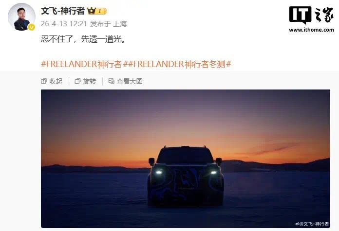 4 月 13 日音书,由奇瑞 × 捷豹路虎合作打造的品牌 FREELANDER 神行者已开启首车预热。据 FREELANDER 神行者环球 CEO、奇瑞捷豹路虎董事 / 常务副总裁文飞共享,神行者的新车已开启冬测。