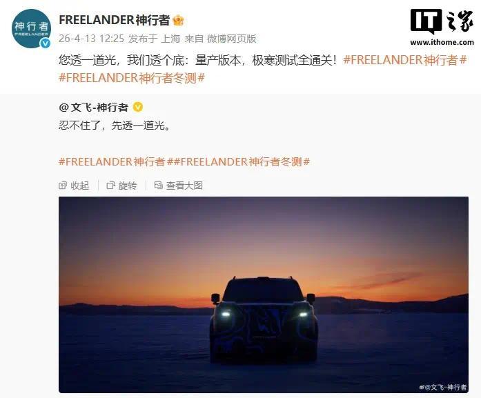 IT之家能干到,FREELANDER 神行者官方连忙转发了该音书,并显现新车量产版块极寒测试全通关。