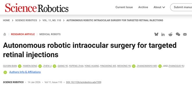IT之家 1 月 19 日音问,据中国科学院自动化参议所官方微信公众号音问,澳门新浦京该所多模态东说念主工智能系统宇宙要点本质室边桂彬参议员课题组得胜研发一款自主显微眼科手术机器东说念主系统,并考证了临床可行性。该系统在所有眼内空间可兑现自主的视网膜下和血管内打针,可显贵提法眼底打针的精确性、安全性和一致性,最大逼迫地减少医源性损害,可缓助外科大夫愈加专注于手术盘算和监督任务。商酌后果近日发表于《科学•机器东说念主》(Science Robotics)。
