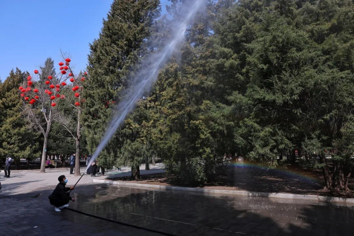 2026年3月15日,北京地坛公园,责任主谈主员往圆柏上喷洒花粉固定剂。(图/视觉中国)