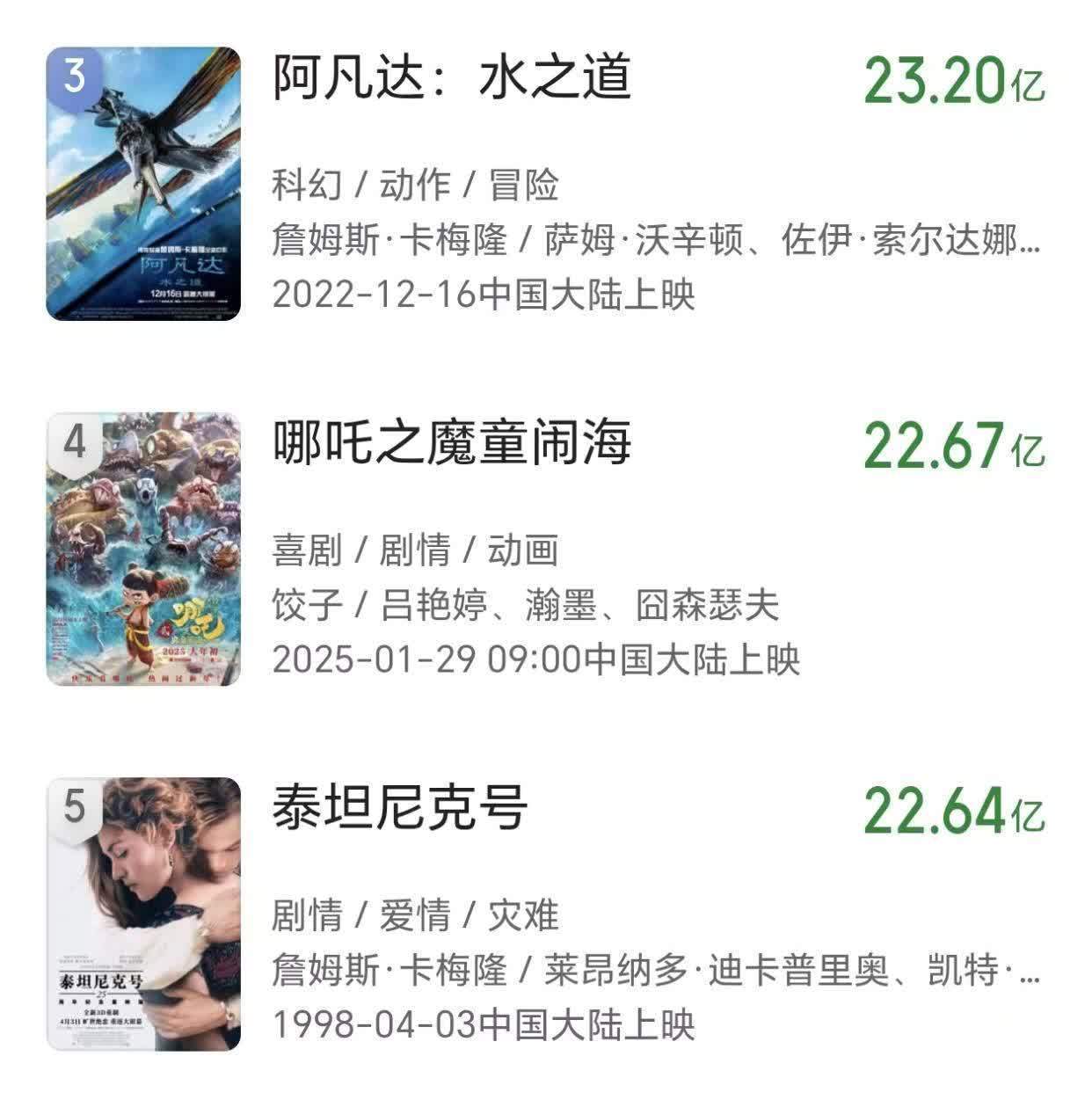 自此,《哪吒2》的寰球名次赞助到了第四,《泰坦尼克号》则降到了第五。