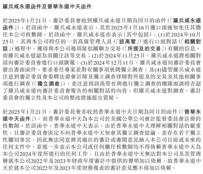 普华永说念中天动作陆金所控股于好意思国公众公司司帐监督委员会注册的核数师,在函件中默示,就陆金所控股2022年及2023年度财务报表的审计主见应不得加以倚赖,并默示陆金所控股或任何继任核数师均不得倚赖其为陆金所控股2024年度所进行的任何责任。