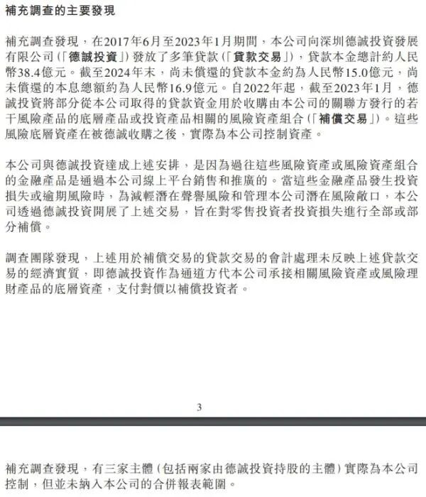 公告提到,走访团队发现,上述用于补偿交游的贷款交游司帐处理未响应上述贷款交游的经济骨子,即德诚投资动作通说念方代陆金所控股连续联系风险资产或风险承诺居品的底层资产,支付对价以补偿投资者。