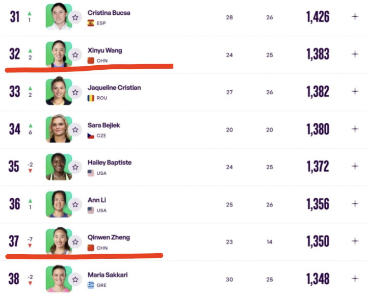 最新的积分榜上,郑钦文积分只消1350分,名次直降7位,来到了第37位。与此同期,王欣瑜的积分则是1383分,比郑钦文高了33分。王欣瑜的名次由上一期的34位造成了现在的32位。